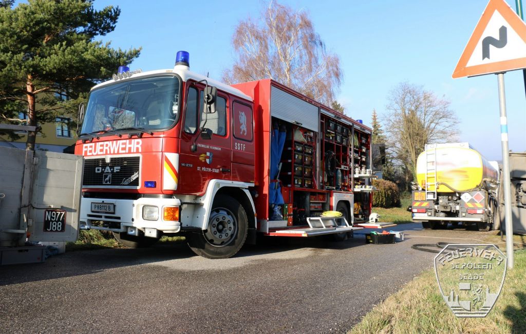Sofort rückte die Schadstoffgruppe der Stadtfeuerwehr zu der Einsatzstelle aus. Zur späteren Bergung des Unfall-LKWs wurde auch das Kranfahrzeug der Feuerwehr St. Pölten - Stadt angefordert. Durch die ungünstige Lage des Tankwagens war das Umpumpen des Heizöls nicht problemlos möglich und nahm einige Stunden in Anspruch. Nachdem ein Großteil des Heizöls in einen zweiten LKW umgepumpt werden konnte, wurde das verunfallte Fahrzeug durch den Kran aufgestellt.