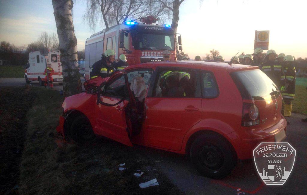 Die Feuerwehr St. Pölten - Stadt wurde am 4. März gemeinsam mit der Freiwilligen Feuerwehr St.Pölten - Pummersdorf zu einem schweren Verkehrsunfall nach Hafing alarmiert, bei welchem ein PKW gegen einen Baum gefahren war.