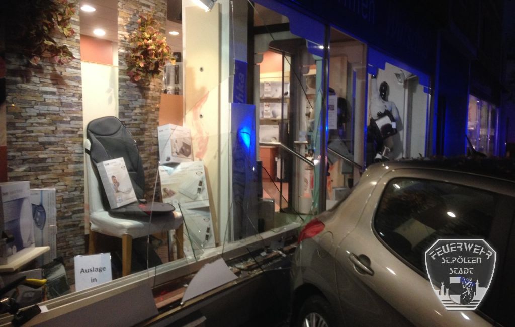 Der verunfallte PKW wurde von der Feuerwehr St. Pölten - Stadt abgestellt und Teile der zerstörten Auslagenscheibe sowie des Fahrzeuges mussten entfernt werden.