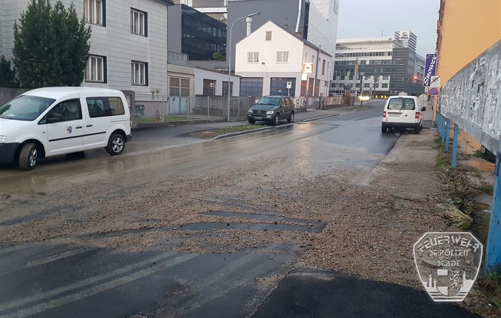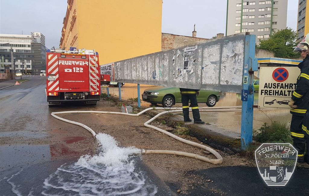 Durch die gewaltigen Wassermengen wurde auch die angrenzende Straße bereits mit Wasser und Dreck überspült. Nachdem seitens der Stadt die Wasserzufuhr abgedreht wurde, konnten die Einsatzkräfte der Feuerwehr mit dem Abpumpen des Wassers beginnen, dessen Spiegel auf dem Parkplatz bereits derart hoch war, dass das Wasser in mehrere PKWs einzudringen drohte.