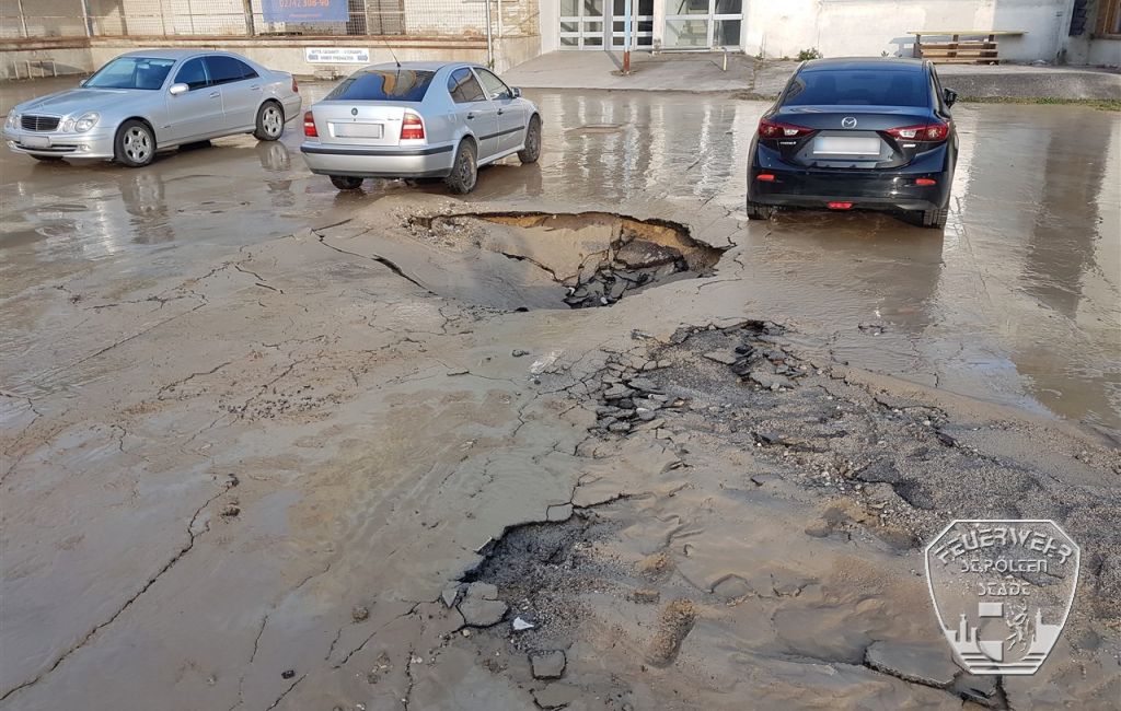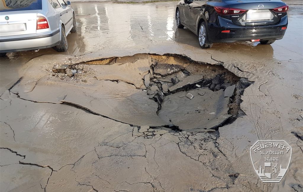 Nachdem ein Großteil des ausgetretenen Wassers abgepumpt war, kam in der Mitte der überfluteten Fläche ein großes Loch zum Vorschein. An dieser Stelle war der Asphalt durch den Wasserrohrbruch unterspült, stark in Mitleidenschaft gezogen worden und dadurch an mehreren Stellen eingebrochen. Aus diesem Grund wurden mehrere Fahrzeuge durch die Feuerwehr aus dem Gefahrenbereich entfernt und der gesamten Parkplatz im Anschluss gesperrt.