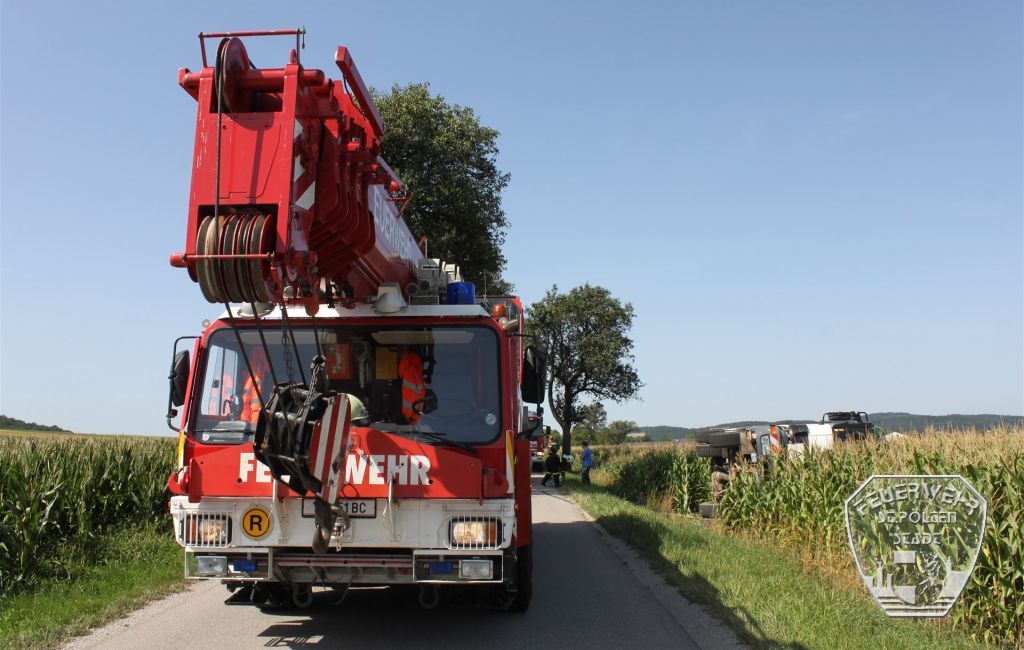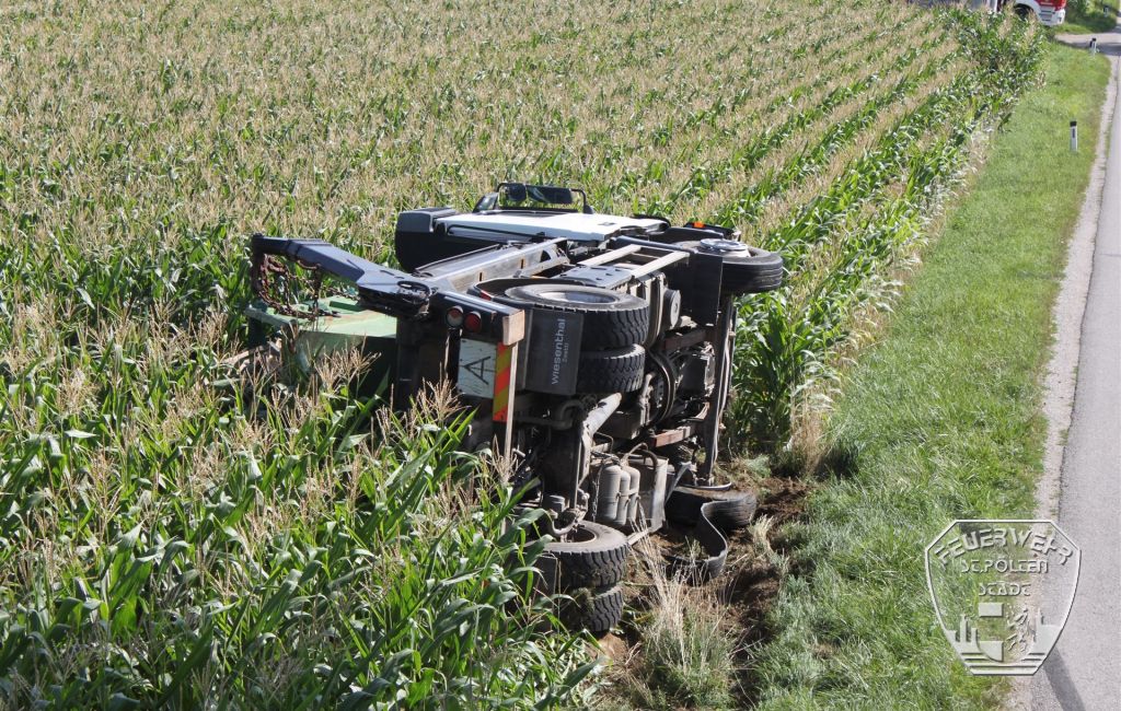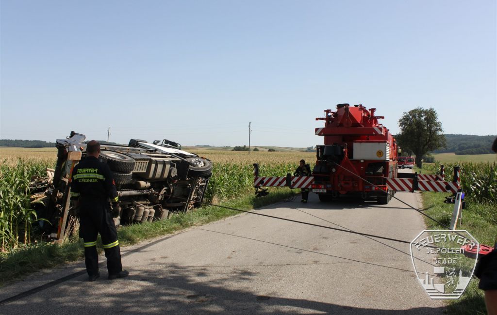 Am Donnerstag, den 3. August wurde die Feuerwehr St. Pölten-Stadt gemeinsam mit der Feuerwehr Böheimkirchen zu einer schweren LKW-Bergungen alarmiert. Ein zwölf Tonnen schwerer LKW war auf der L2285 zwischen Röhrenbach und Wiesen verunglückt.