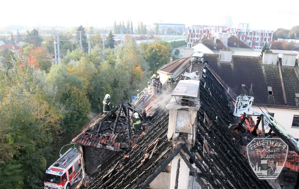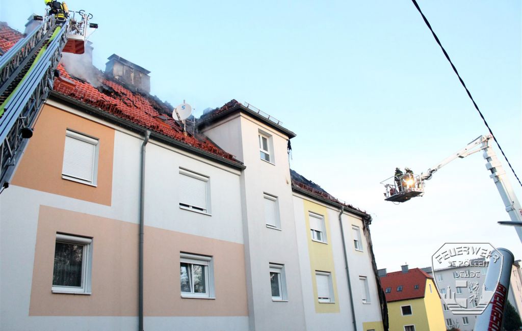 Beim Eintreffen an der zweiten Einsatzadresse, hatte das Feuer bereits auf die Fassade des angrenzenden Mehrparteienhauses übergegriffen. Sofort wurde die Alarmstufe erhöht und weitere Feuerwehren alarmiert. Der Brand breitete sich sehr schnell auf den gesamten Dachstuhl des Hauses aus. Neben der Bekämpfung des Brandes galt es, alle Bewohner aus dem betroffenen Gebäude zu retten. Einsatzkräfte der Feuerwehr und der Polizei evakuierten das gesamte Gebäude mit vereinten Kräften. Da auf der Straße viele Autos geparkt waren und immer wieder Teile vom Dach fielen, wurden einige Fahrzeuge mittels Gleitern aus dem Einsatzbereich entfernt.