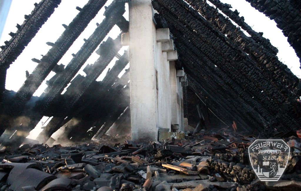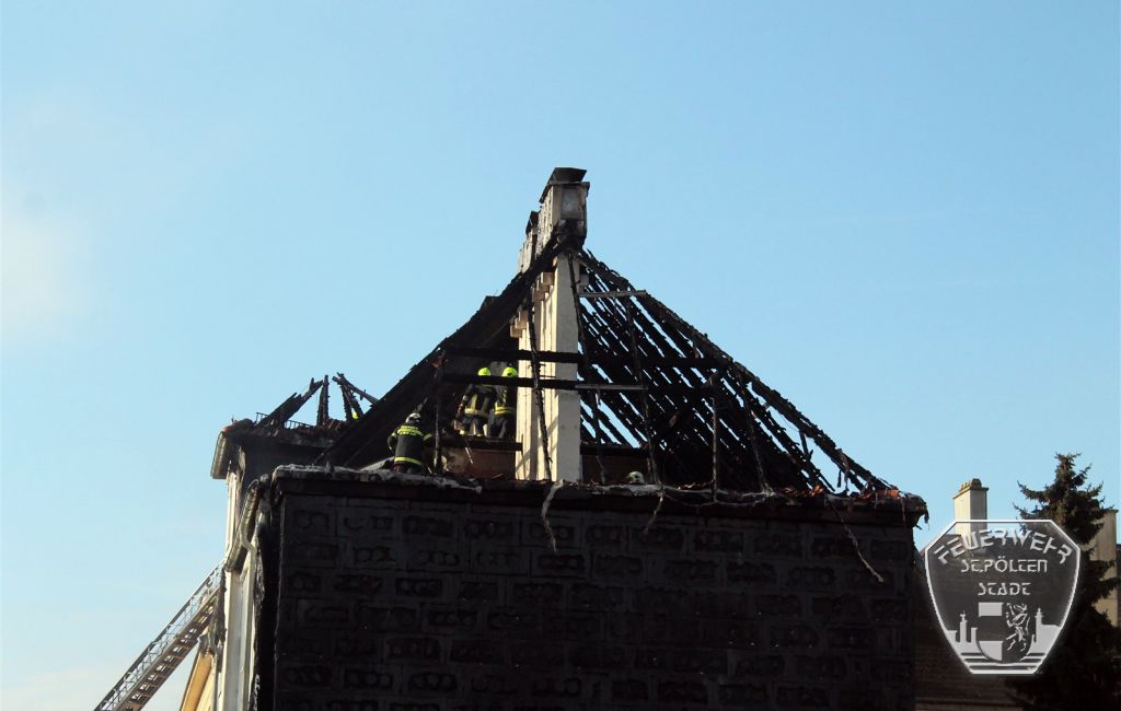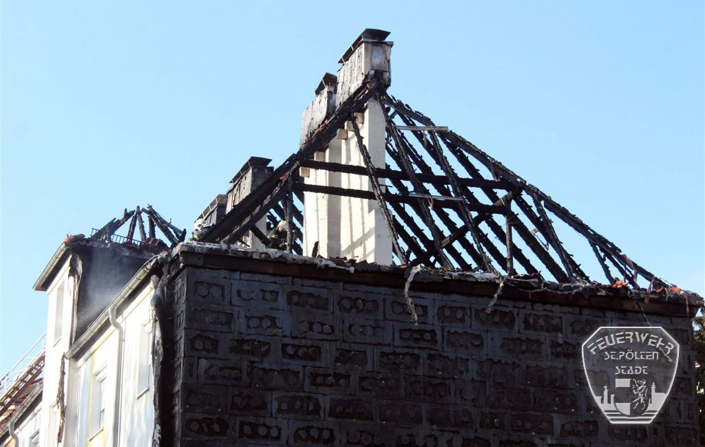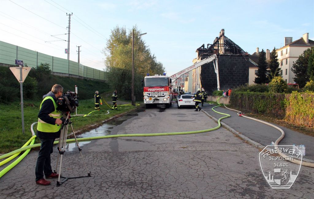 Da der Brand nicht nur auf den Dachstuhl, sondern auch auf die Zwischendecke darunter übergegriffen hatte, standen mit einer Teleskopmastbühne und zwei Drehleitern, drei Hubrettungsgeräte im Einsatz. Um alle Glutnester erreichen zu können, musste das Dach des Gebäudes geöffnet werden.