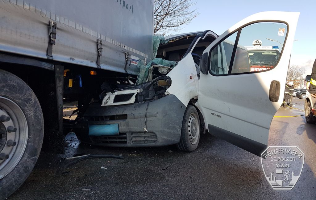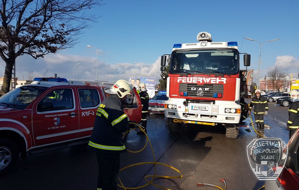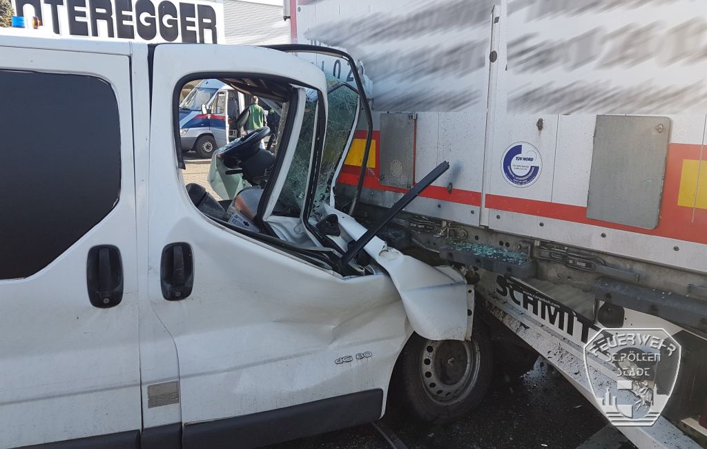 Die Feuerwehr St. Pölten Stadt wurde am 18. Dezember um 12.14 Uhr zu einem Verkehrsunfall mit eingeklemmter Person alarmiert. Ein Kleintransporter ist aus uns unbekannter Ursache auf einen am Strassenrand stehenden LKW aufgefahren. Durch den Aufprall wurde das Fahrzeug stark deformiert und der Fahrer im Fuß-und Bauchbereich eingeklemmt. Die verletzte Person wurde mittels hydraulischem Rettungssatz aus dem Wrack befreit.