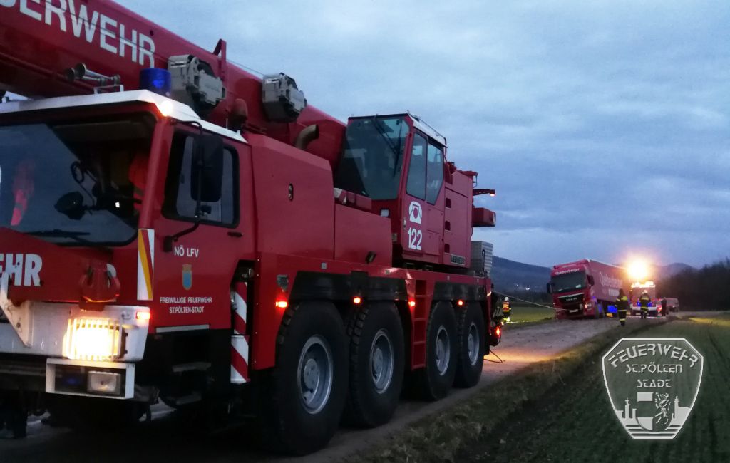 Am Mittwoch, den 28.03.2018 forderte die FF St.Pölten-St. Georgen die FF St. Pölten-Stadt zur Unterstützung bei einer LKW-Bergung an. Bei Ganzendorf war ein Sattelzug von der Fahrbahn abgekommen und steckte im Straßengraben fest.