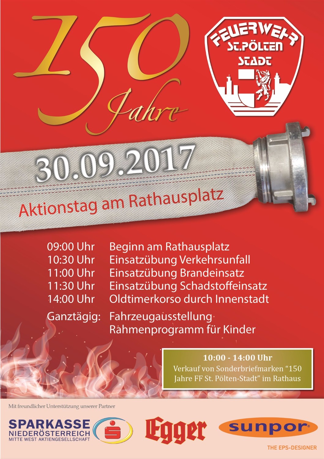 Die Freiwillige Feuerwehr St. Pölten-Stadt feiert 2017 das 150. Bestandsjahr. Anlässlich des Jubiläums veranstaltet die Stadtfeuerwehr am 30. September 2017, ab 9:00 Uhr am Rathausplatz St. Pölten einen Aktionstag mit umfangreichem Rahmenprogamm. Neben einem historischen Umzug, welcher vom modernsten Löschfahrzeug bis zurück zu den ersten Feuerwehrkutschen die Fahrzeuggeschichte der Feuerwehr abdeckt, wird auch der aktuelle und hochmoderne Fuhrpark der Feuerwehr St. Pölten-Stadt direkt auf dem Rathausplatz ausgestellt sein.