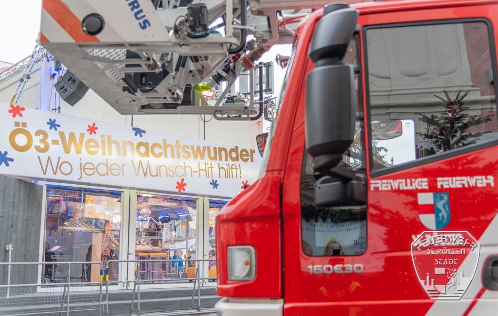 Der Feuerwehr St. Pölten-Stadt ist die Unterstützung des diesjährigen „Ö3 Weihnachtswunders“ am Rathausplatz St. Pölten ein großes Anliegen. Aus diesem Grund überlegte sich das Kommando eine ganz besondere Aktion: am Nachmittag des 21. Dezember wurden beide Hubrettungsgeräte der Stadtfeuerwehr rund um den Weihnachtsmarkt in Stellung gebracht.