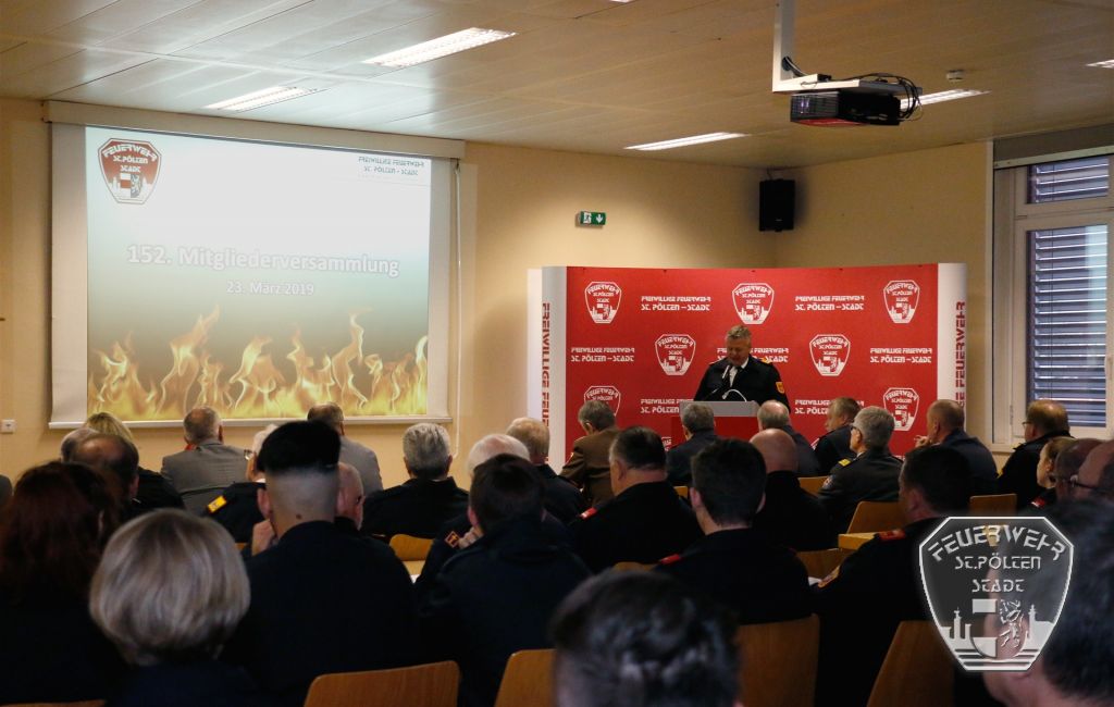 Am Samstag den 23. März 2019 wurde die 152. Mitgliederversammlung der Feuerwehr St. Pölten-Stadt in der Feuerwehrzentrale St. Pölten abgehalten. Die zahlreichen Ehrengäste und Feuerwehrfunktionäre ließen gemeinsam mit den Mitgliedern das Feuerwehrjahr 2018 noch einmal Revue passieren.